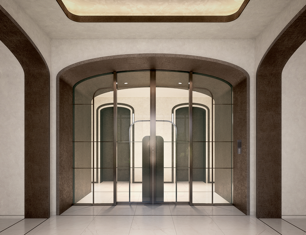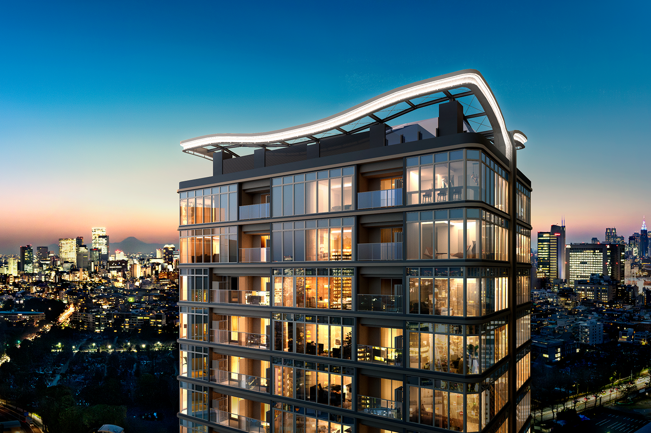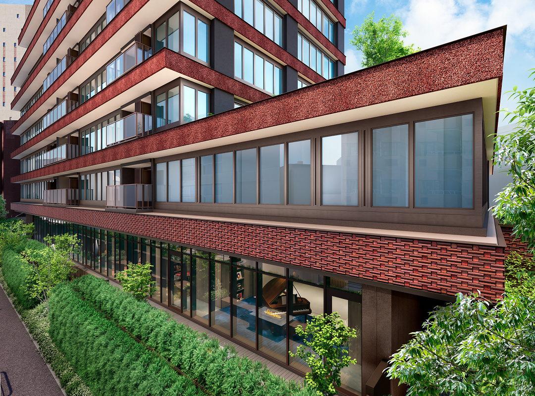 ここに住まう方々が、ただ暮らすだけでなく日々の躍動に向けた“止まり木”となり、自分らしい未来へと羽ばたく力を得られる住まいにしたい。そんな想いを込めてコンセプトは「Fly Up」としました。そして外観・ランドスケープ・共用部デザインはホシノアーキテクツさんに具現化していただきました。外観は低層と高層で異なる2面性を持ち、低層部は乃木坂の豊かな緑や周辺建物、本敷地にあった建物のレンガ調を継承し、高層部は空を映す美しいガラスファサードで、頂部にはFly Upを象徴する、空へ翼を広げるようなクラウンを設けました。緩やかなカーブ表現やライトの色味・明るさ・向きなど、関係者で何度も協議を重ねて実現しました。