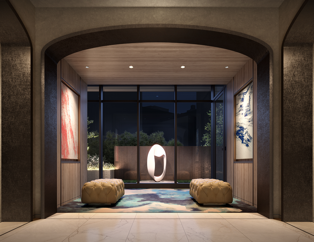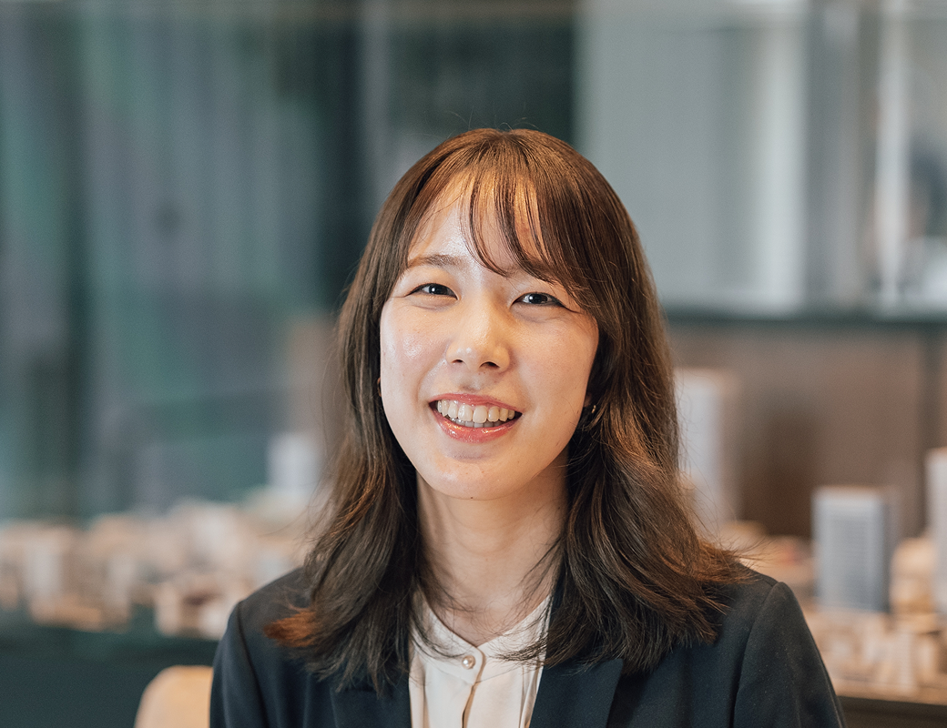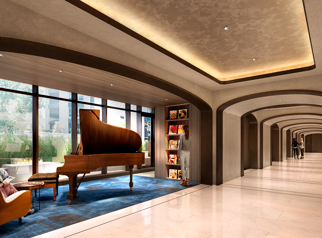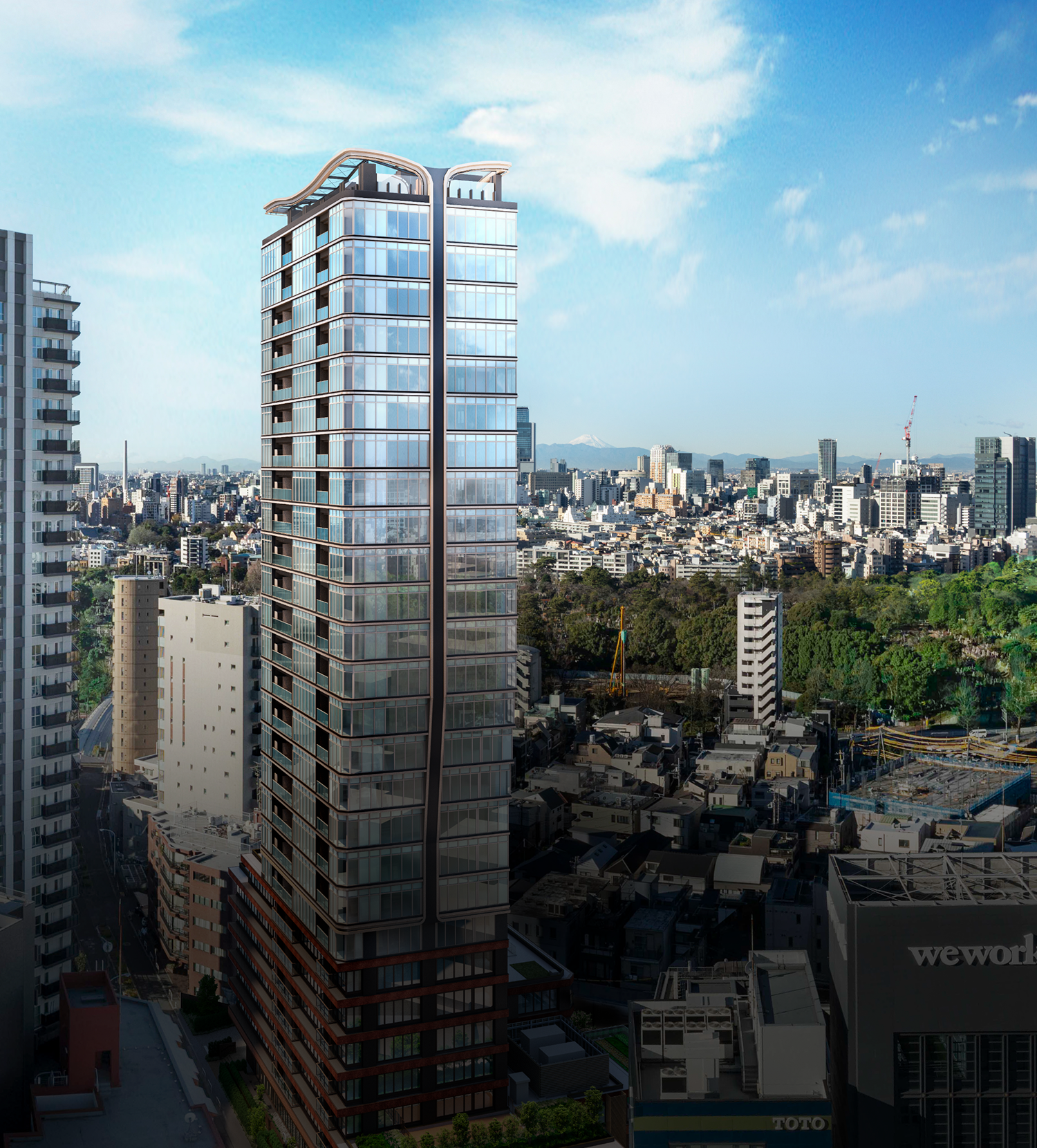 ここに住まう方々が、ただ暮らすだけでなく日々の躍動に向けた“止まり木”となり、自分らしい未来へと羽ばたく力を得られる住まいにしたい。そんな想いを込めてコンセプトは「Fly Up」としました。そして外観・ランドスケープ・共用部デザインはホシノアーキテクツさんに具現化していただきました。外観は低層と高層で異なる2面性を持ち、低層部は乃木坂の豊かな緑や周辺建物、本敷地にあった建物のレンガ調を継承し、高層部は空を映す美しいガラスファサードで、頂部にはFly Upを象徴する、空へ翼を広げるようなクラウンを設けました。緩やかなカーブ表現やライトの色味・明るさ・向きなど、関係者で何度も協議を重ねて実現しました。