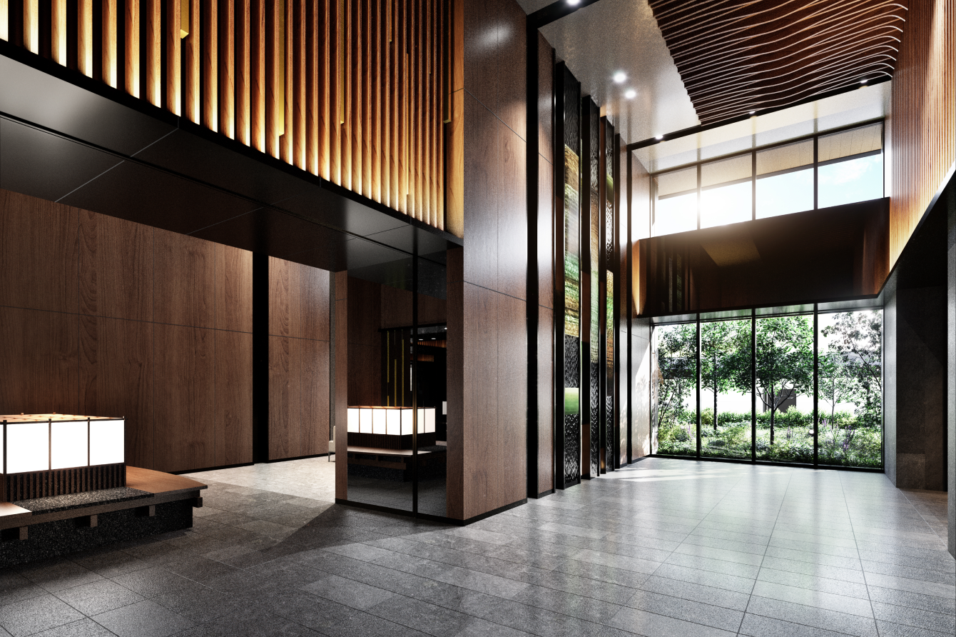 デザインのテーマは、伝統の継承と現代的アレンジ。JR「長野」駅から徒歩5分、善光寺の門前町としての歴史を受け継ぐ表参道沿いに位置する「Brillia 長野北石堂 ALPHA RESIDENCIA」では、長野の自然や歴史を象徴する木目や格子のデザインを採用。悠久の時への敬意と、周囲の街並みとの調和を図り、表参道沿いのシンボルとなる住まいを目指しました。