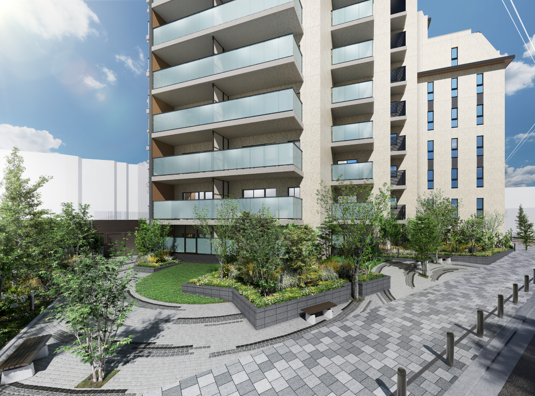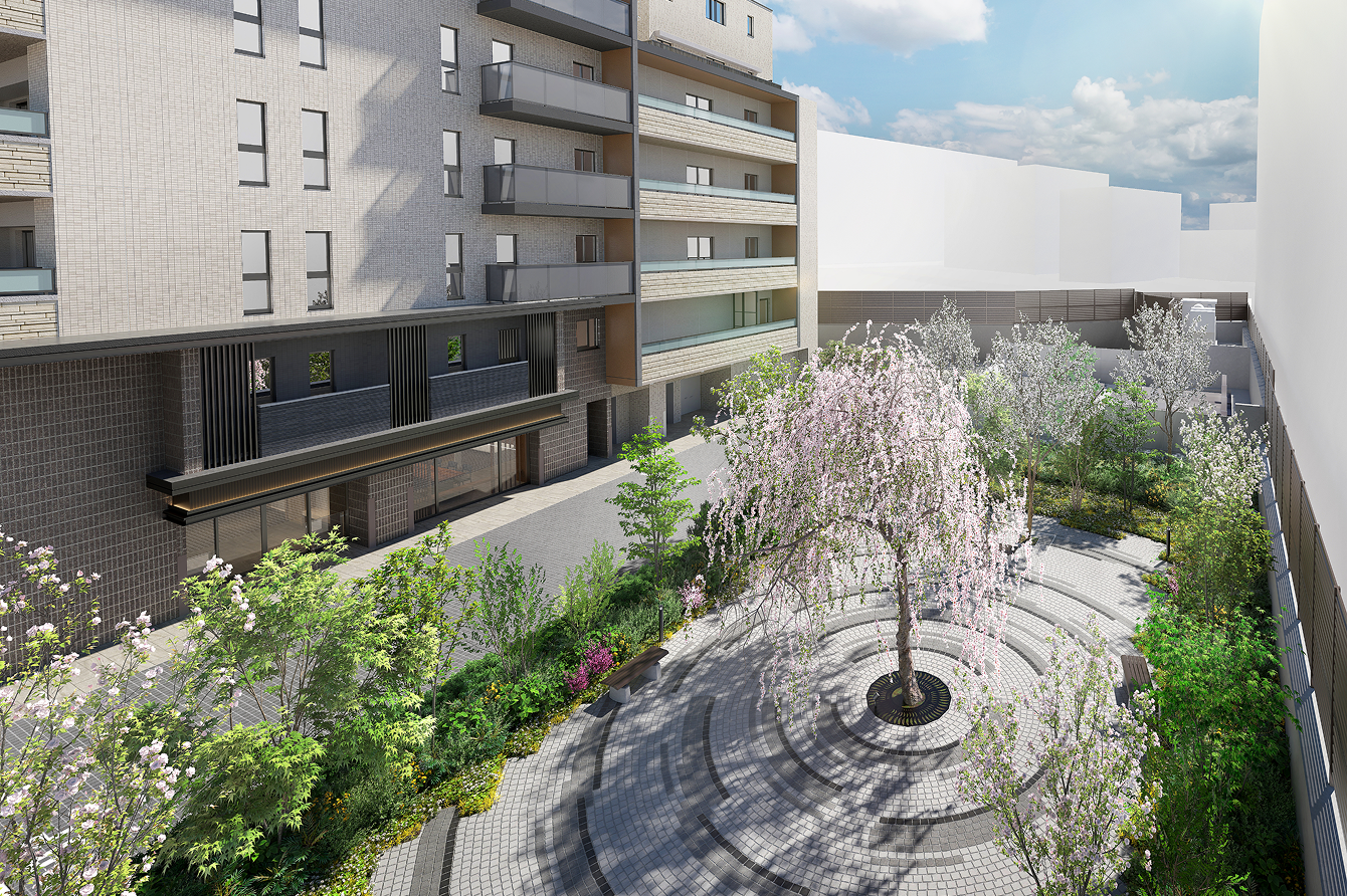 また、本物件計画地は従前築50年近くの複合建物が建っており、面積が約4,000m2超で前面道路も広く、周囲からの視認性が高い土地です。建物の更新と合わせて、地域への価値提供として敷地の南北2箇所に桜をテーマにした広場状空地を設け、地域の方々もご利用いただける憩いの空間も整備しました。