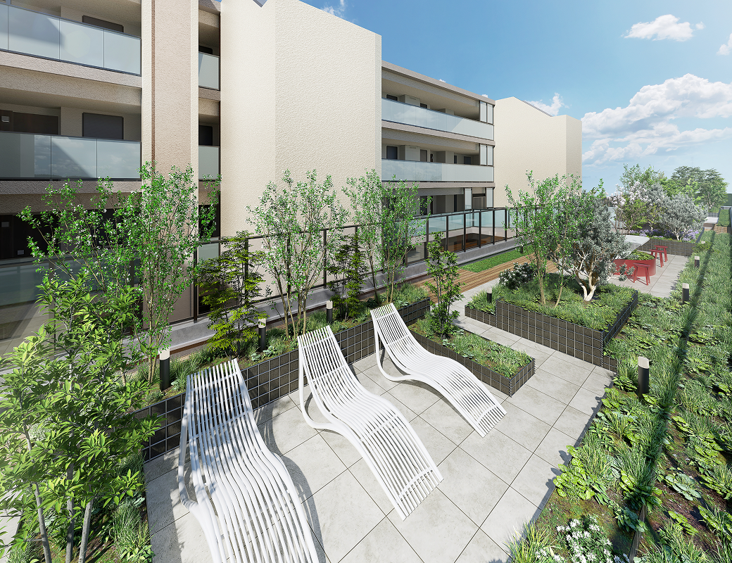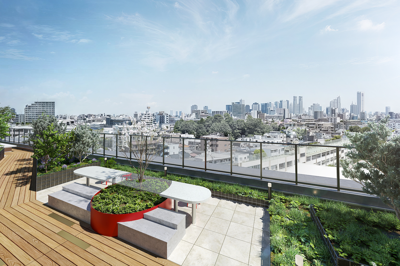 屋上庭園は緑を生かした空間デザインに長けた「parkERs(パーカーズ)」様に監修いただき、『暮らしの庭』をコンセプトに4つのゾーンで構成しました。緑を身近に感じつつ、眺望も楽しみながら、お住まいになられる方々同士の交流が生まれる場になればと考えています。