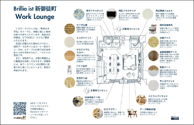 ワークラウンジ内には使用した素材を紹介する二次元コード付きのパネルを設置しました。読み取っていただくと、サステナブルなマテリアルに特化したプラットフォーム「Matinno(※1)」に飛び、それぞれの素材が持つストーリーを知ることができます。
