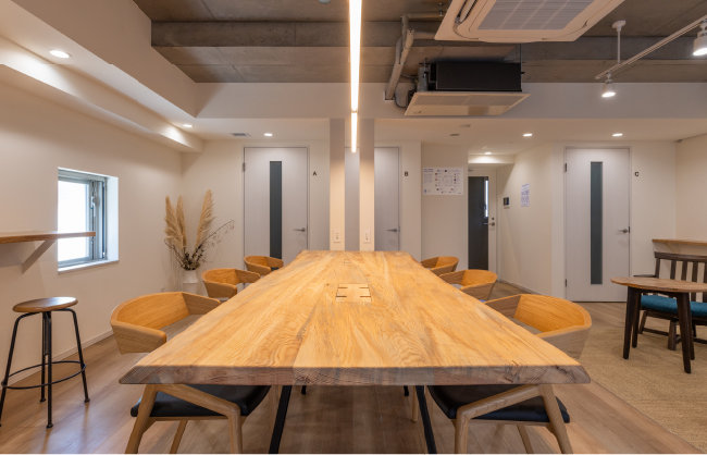 デスクだけでなく、ゆったり過ごせるエリアも設けています。テーブルやラウンジチェアなどの家具は、リビングに置いても違和感のないデザインでありながら、オフィスとしての機能性も兼ね備えたものを選定。レイアウトにもこだわり、隣同士に座っても1mほどの間隔が保てるようにしています。