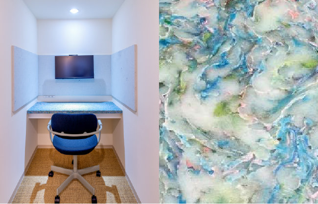 例えば、個室ブースには海洋プラスチックデスク(※2)を採用。天板は海洋ごみを回収して板状に加工した素材で、「花畑のような雰囲気にしてください」とオーダーしました。さまざまな色が入っていますが、少し離れると青っぽく見えて、ネモフィラで有名な「ひたち海浜公園」の風景を思わせます。