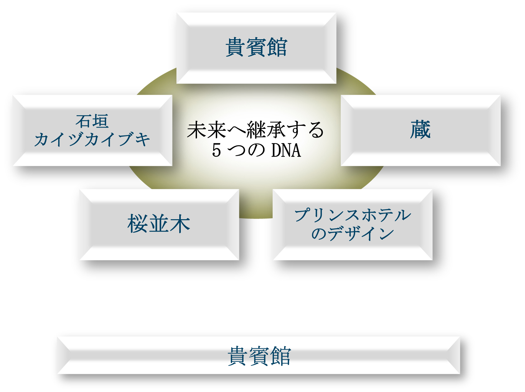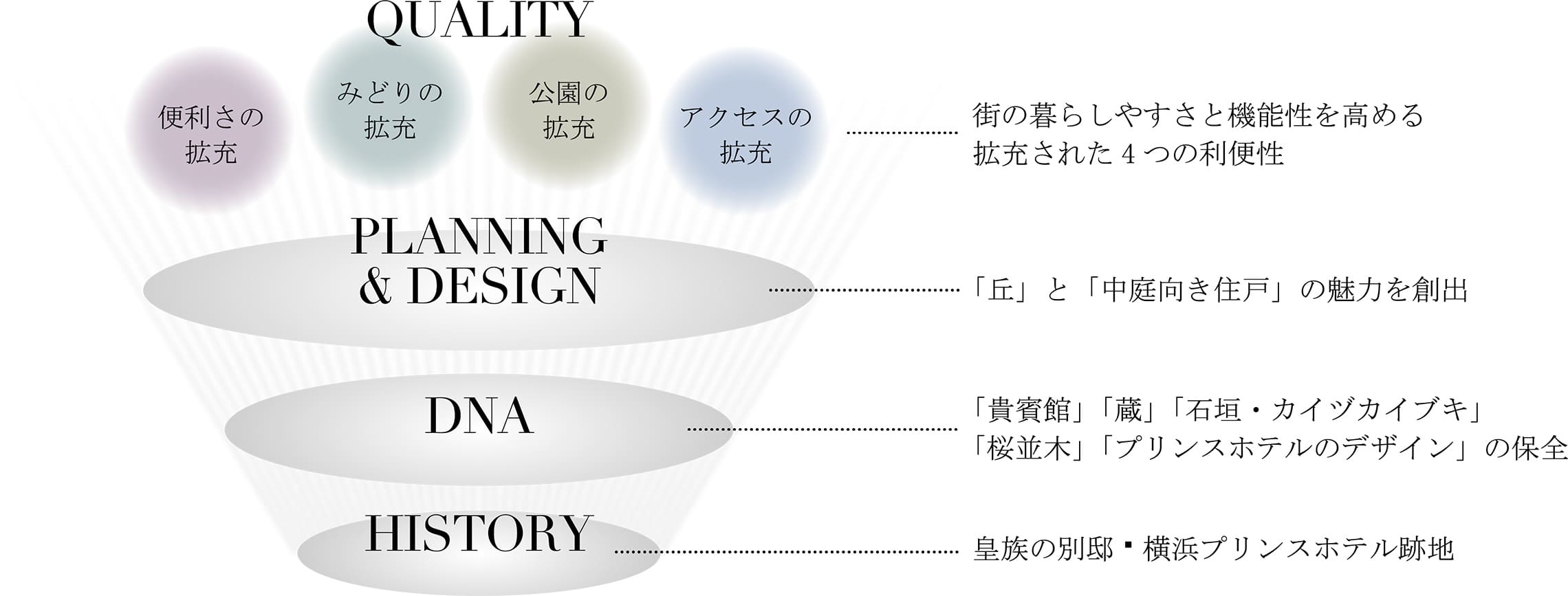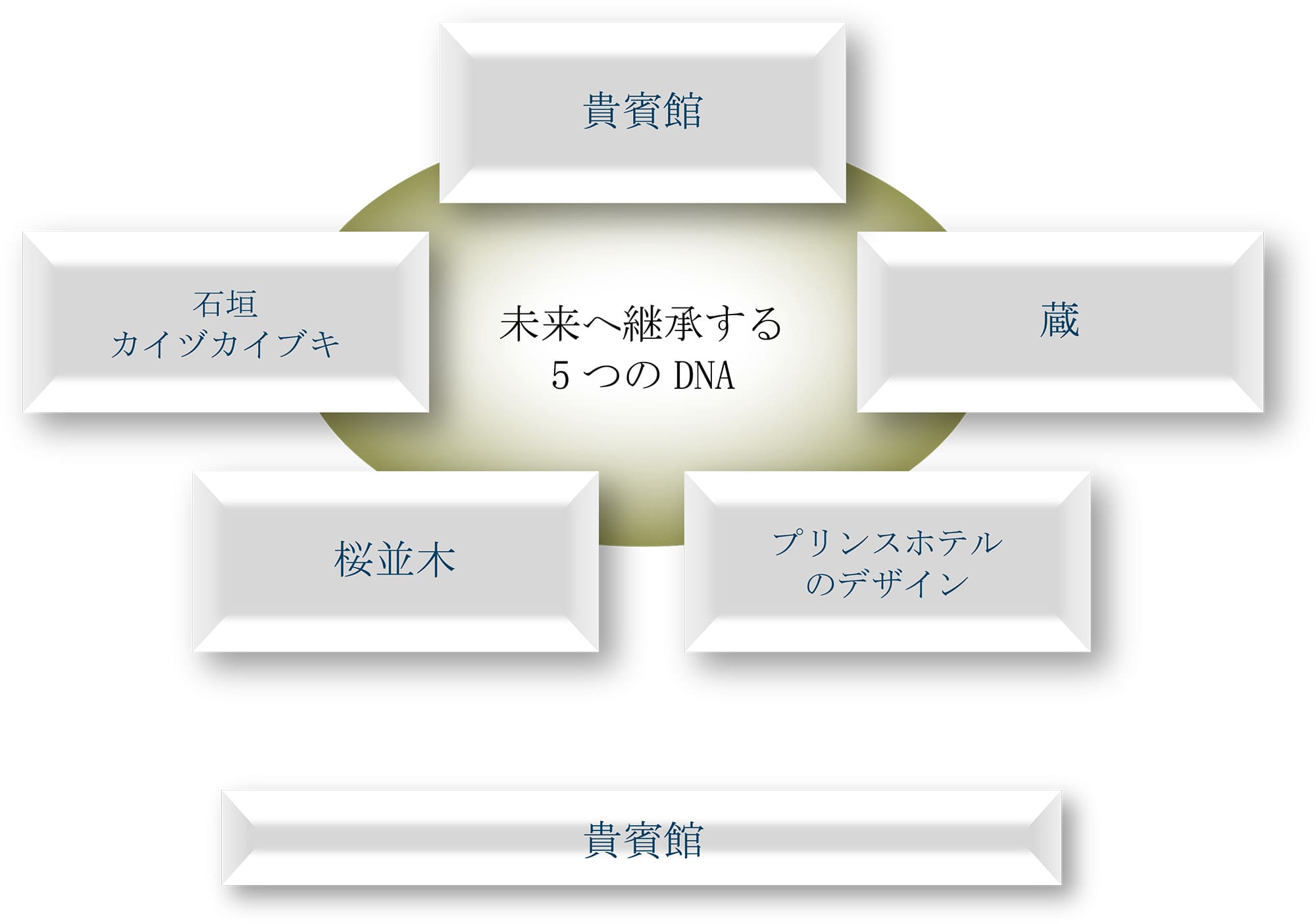 東伏見邦英伯爵 別邸であった「貴賓館」。保存が困難で取り壊しせざるを得なかった「蔵」。再現性の難しい、しかし価値の高い「石垣・カイヅカイブキ」。近隣にお住いの方々に愛されてきた「桜並木」。街のランドマークであった「プリンスホテルのデザイン」。これら5つの歴史的資源を未来へ承継すべく、これからも活用できる新しいカタチを模索し、街の重要な要素として、継承されるようなデザインを目指しました。