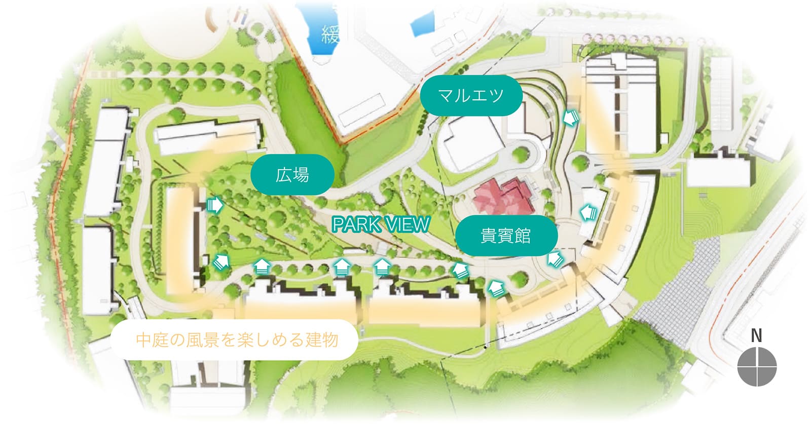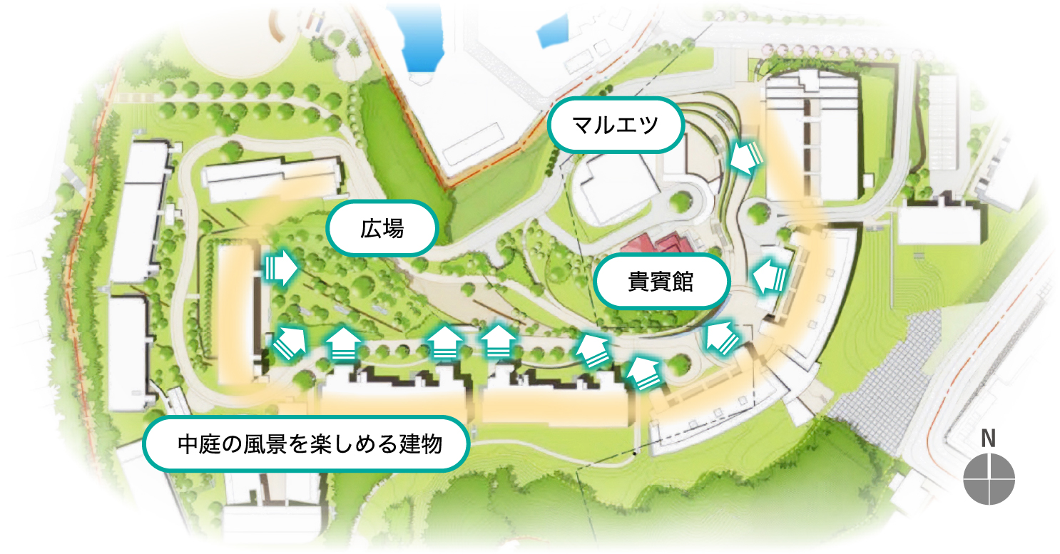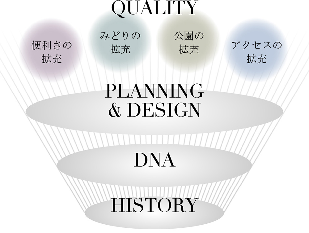 丘の上の広大な敷地に“新しい街”をつくり出すために「便利さ」「みどり」「公園」「アクセス」の4つを拡充を図りました。丘の上で生活するメリットに加え、生活利便性を上げることで、敷地内でできることが増え、街の機能性を高めることを目指しました。竣工から10年経過した現在では、住人や近隣の方々が頻繁に行き交い、さまざまなコミュニケーションが育まれる“成熟した街”へと変貌を遂げています。