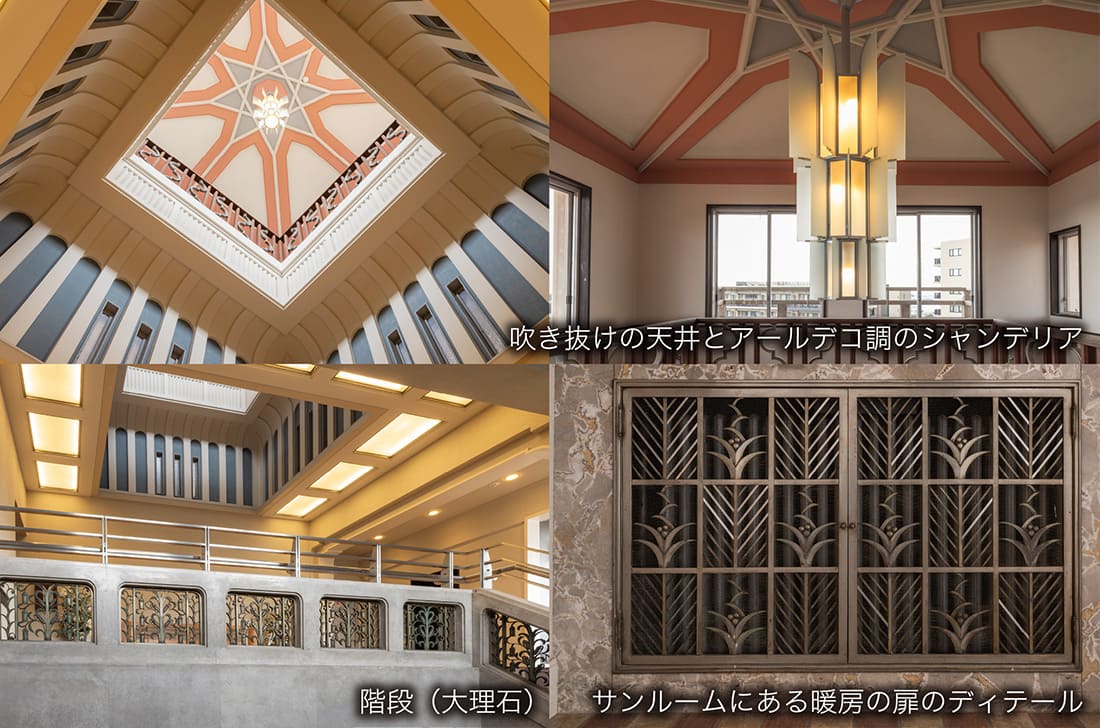 皇族の方が建築した建物だけあって、内部の装飾や素材は重厚感とデザイン性を兼ね備え、贅沢な雰囲気を醸し出しています。大理石を多用した階段や吹き抜け天井、アールデコ調のシャンデリアなど、当時設えたものも数多く残しており、価値の高い空間を感じることができます。