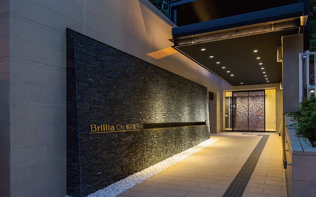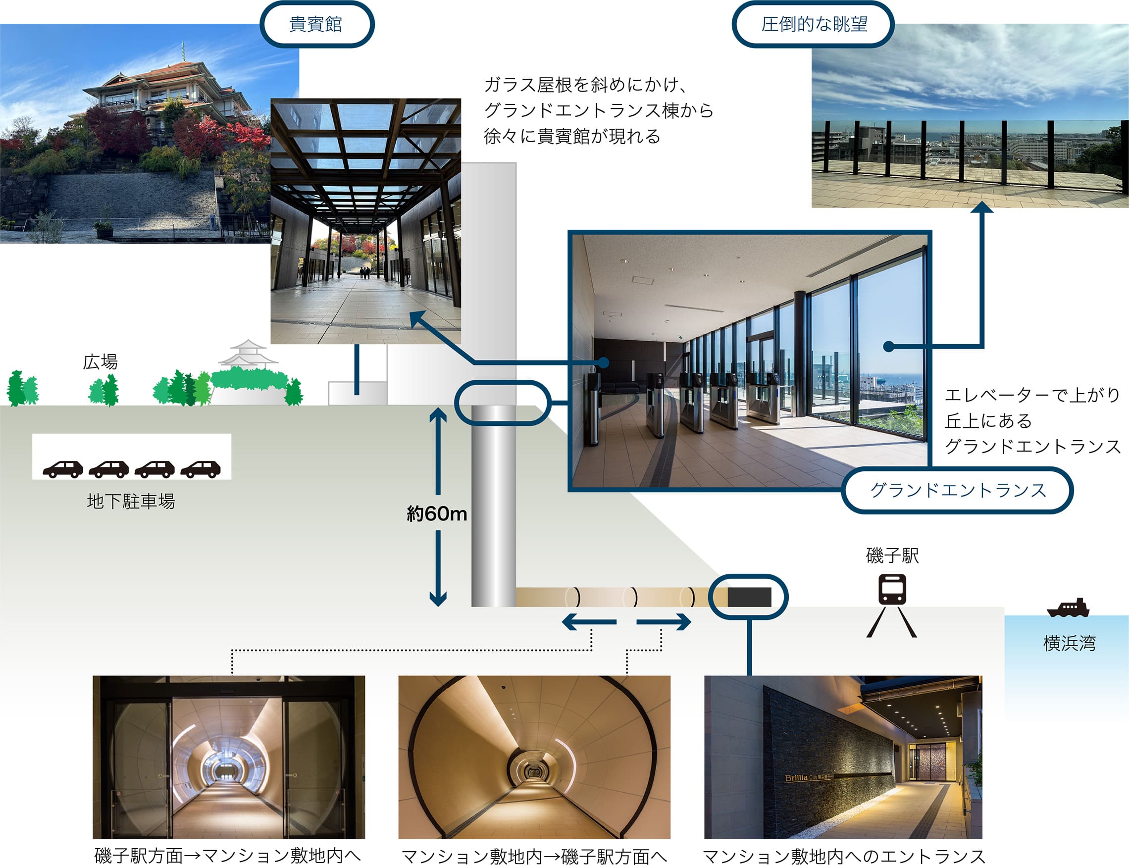 シーン設計を導入し、住まう人の情景をイメージして、マンションを企画、設計したBrillia City 横浜磯子。丘上の魅力を最大限感じてもらう工夫がふんだんに盛り込まれています。敷地入口のエントランスからエレベーターへ向かうトンネルには、照明を巧みにコントロールした暖色が、帰宅した時の安堵感を醸し出します。そこからエレベーターで60m上がると圧倒的な眺望の力を全身で感じることができます。さらに、敷地内へつながる通路を進むと、出口に木々や石垣が見え、歩き進むと、貴賓館が徐々に見え始め、通路を抜けた先には全容が現れ、誰もが心が揺さぶられるような情景に出会えることができます。このような体験を帰宅するたびに味わえるよう全体設計を考案しました。