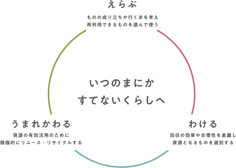 一人ひとりが物をすぐに捨てずに、「えらぶ」「わける」「うまれかわる」という