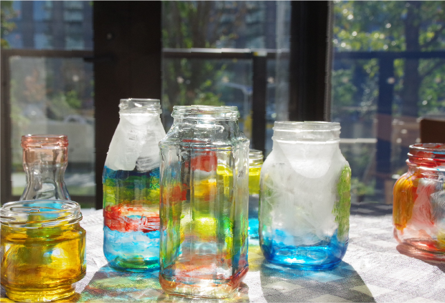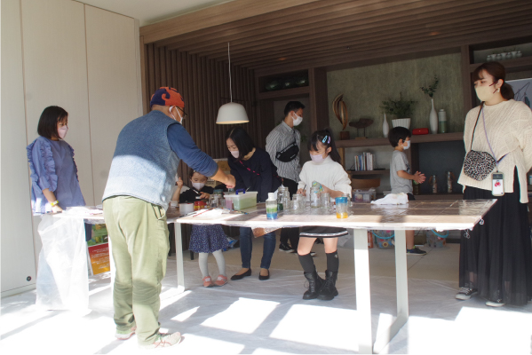 [Brillia Tower 聖蹟桜ヶ丘 BLOOMING RESIDENCE]では、パーティールーム等の共用施設でご入居者様向けのワークショップを実施。自宅から使わなくなった空き瓶を持参してもらい、それにステンドグラスのような仕上がりになる絵の具を塗り、空き瓶を再利用するプログラム「空きびんアップサイクル体験」や、身近な段ボール素材を使って資源循環への理解を深める「段ボールペン&コインケースづくり」、水槽の中でおきる自然界の循環のしくみを学ぶ「メダカのワークショップ~飼育体験」「苔テラリウムワークショップ」などを行いました。