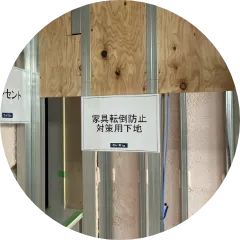 軽量鉄骨の骨組みの中に、家具の転倒防止や手摺設置用の下地補強材を設置しています。