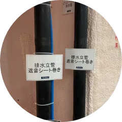他住戸からの流水音を軽減するため、排水立管にシート状の吸音材・遮音材等を巻き付けています。